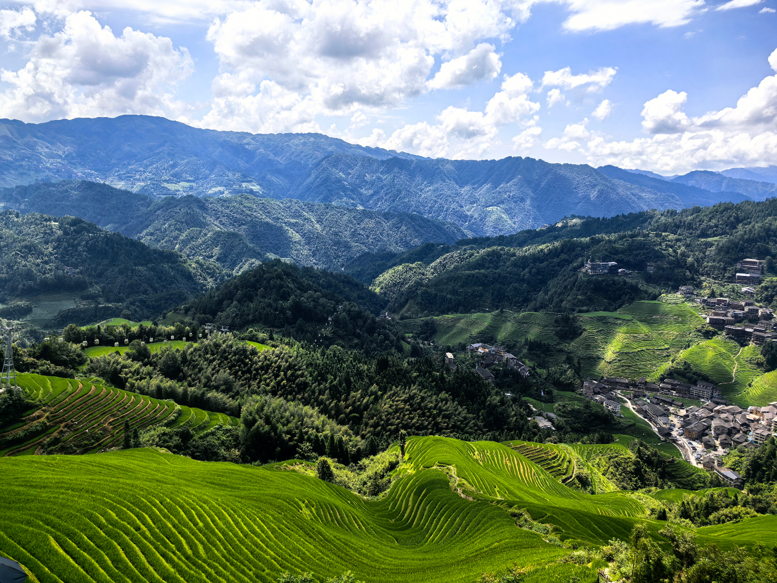龙脊梯田是先人在大地上写就的诗行,是人类在崇山峻岭中谱写的乐章。磅礴山体上,梯田如链似带,从山脚盘绕至山顶,层层叠叠,高低错落;线条行云流水,规模大气壮阔,具有不可比拟的和谐美;这如诗如画的意境,令人惊叹和震撼,被誉为“挂在天边的美景”。