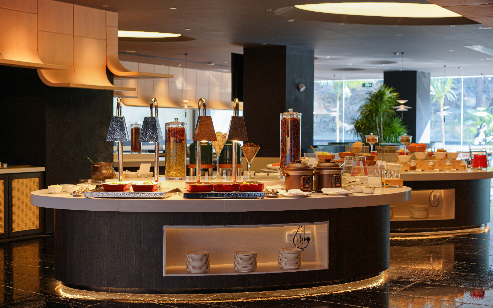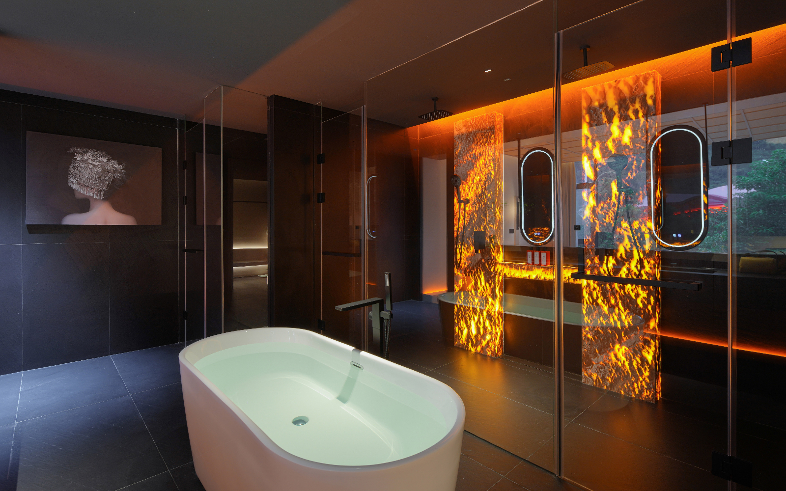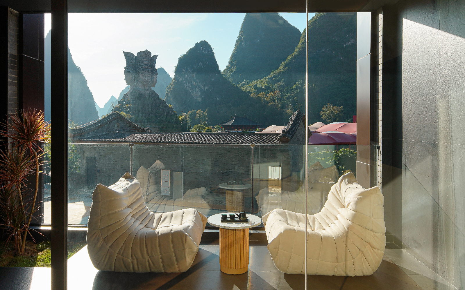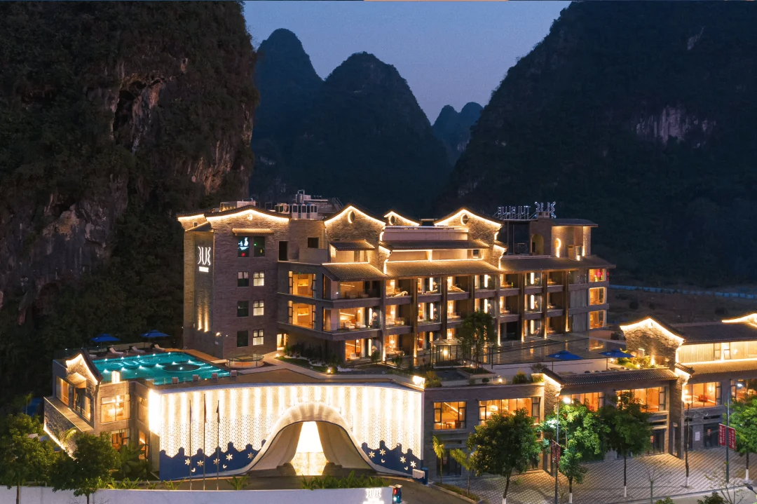 酒店前瞰桂林千古情,左揽阳朔遇龙河 以水墨画为灵感,山形大门+巴西奢石影墙,壮锦元素贯穿空间,古筝光影秀超惊艳! 户外恒温泳池背靠青山,泡水赏景仿佛“人在画中游”