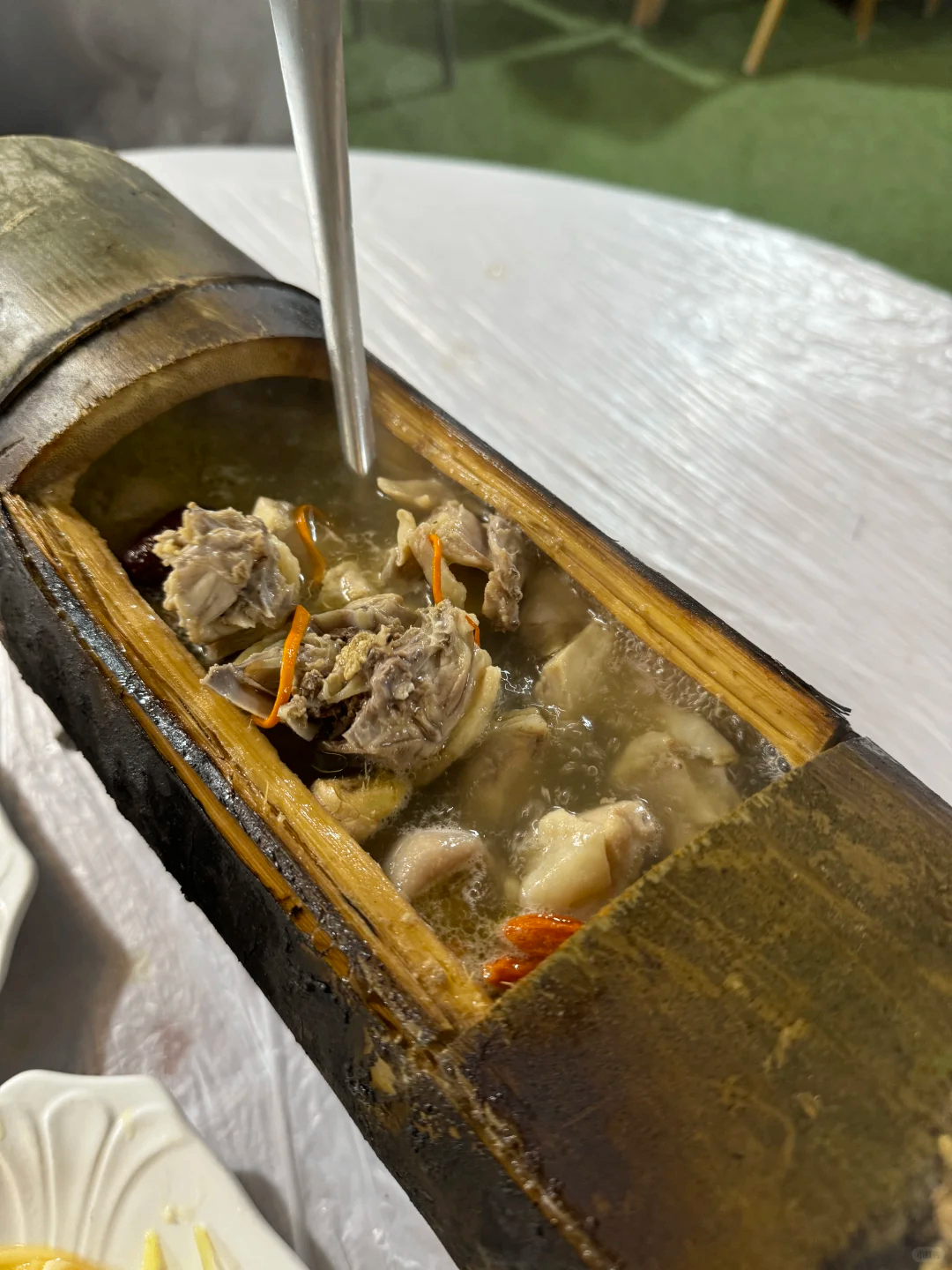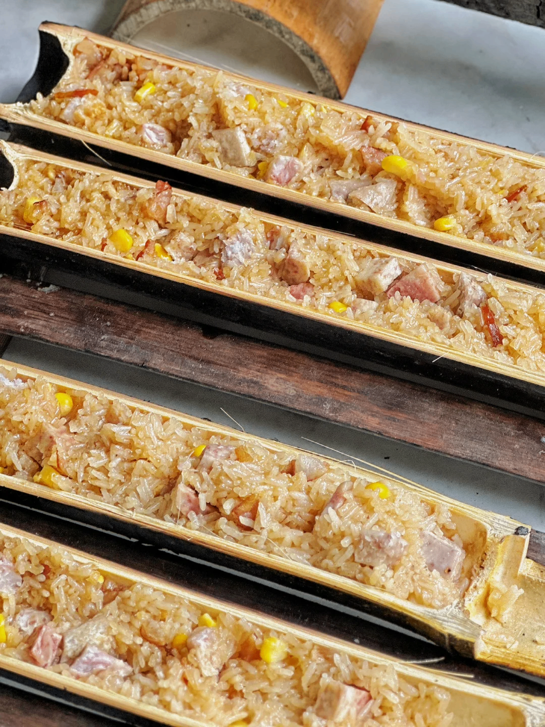 竹筒饭唤醒味蕾 —— 新鲜楠竹劈开,装入泡好的糯米、咸香腊肉和香甜玉米粒,炭火慢蒸 1 小时,打开竹筒的瞬间,竹香混着肉香扑面而来,米饭吸满竹筒精华,软糯中带着颗粒感,连吃两碗都不过瘾。