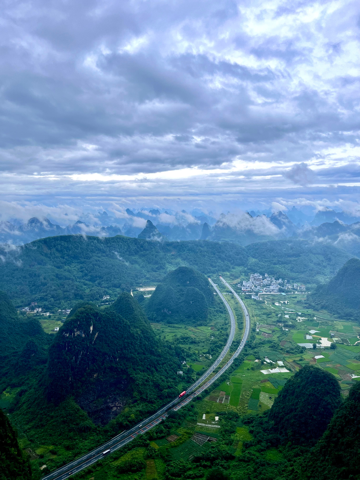 如意峰——乘坐缆车向上,云雾在山间缭绕,仿佛闯入仙境。登顶后站在观景台,阳朔全景尽收眼底,漓江像一条碧绿的丝带缠绕山间。