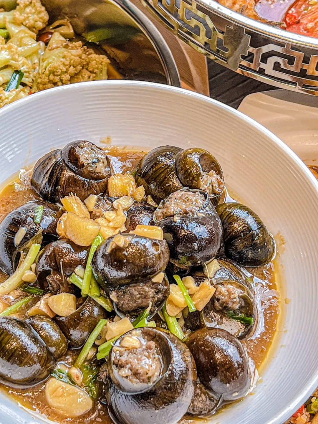 阳朔手工田螺酿也让人惊艳,螺肉混合猪肉、紫苏剁成馅,塞回田螺壳里焖煮,嗦一口鲜辣入味,连螺壳里的汤汁都不放过;