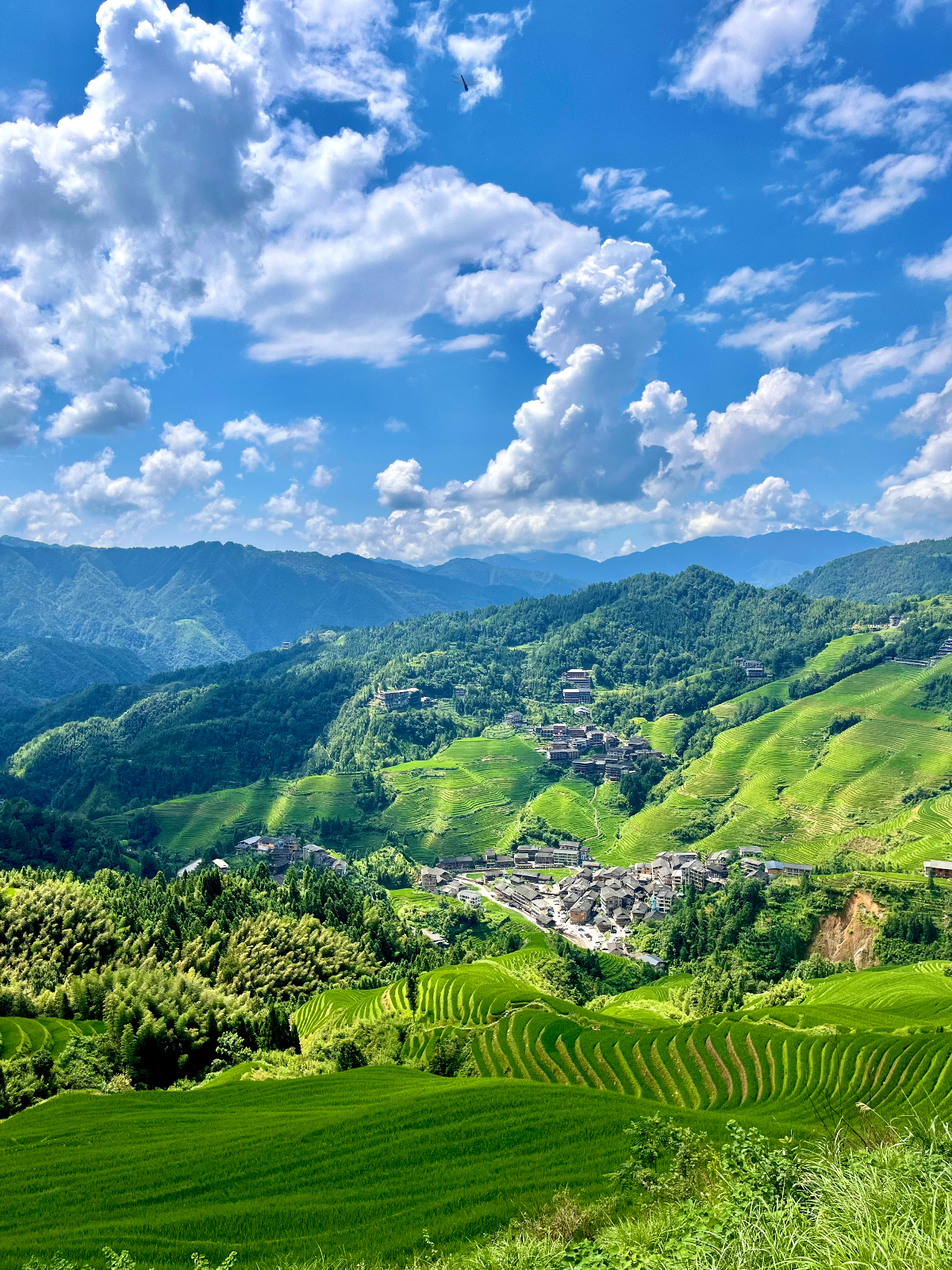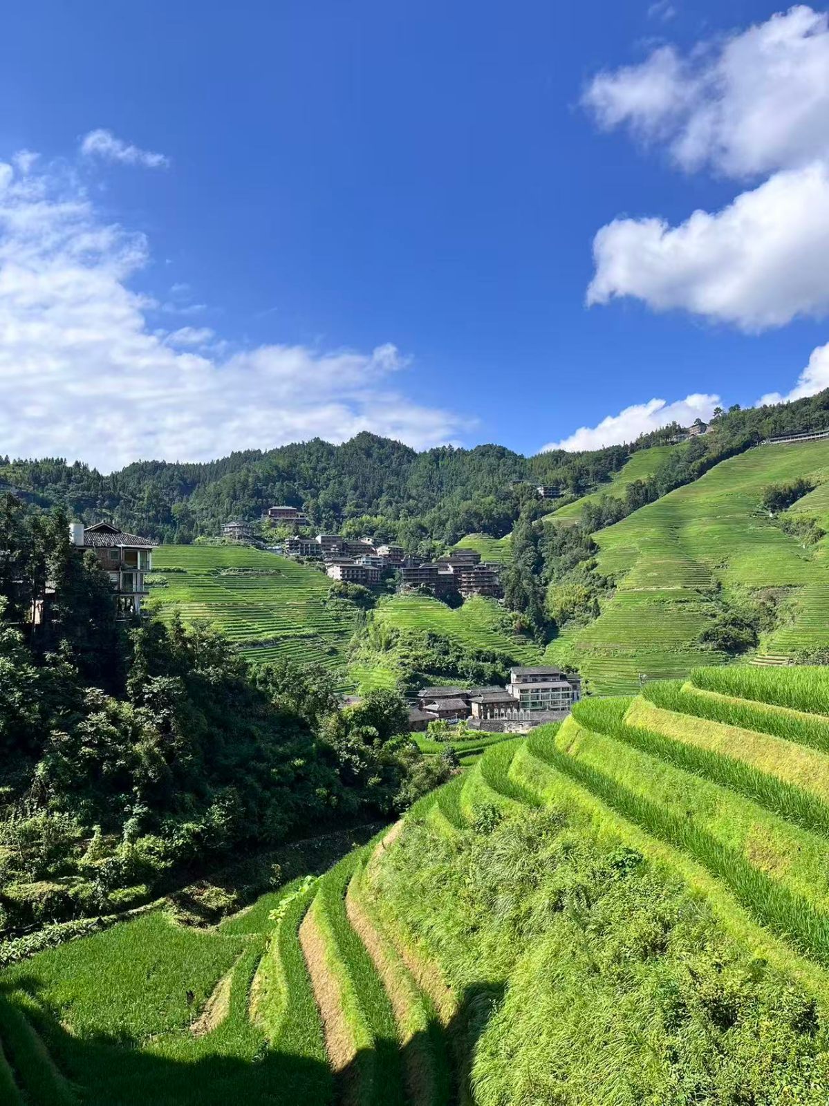 龙脊梯田——站在观景台,层层叠叠的梯田从山脚延伸到山顶,在阳光的照耀下像洒满了碎金,壮观得让人失语。大家沿着田埂漫步,脚下是松软的泥土,身边是绿油油的禾苗,仿佛与这片土地融为一体。当地村民热情地给我们介绍梯田的历史,让我们对这份 “大地艺术” 多了几分敬畏。