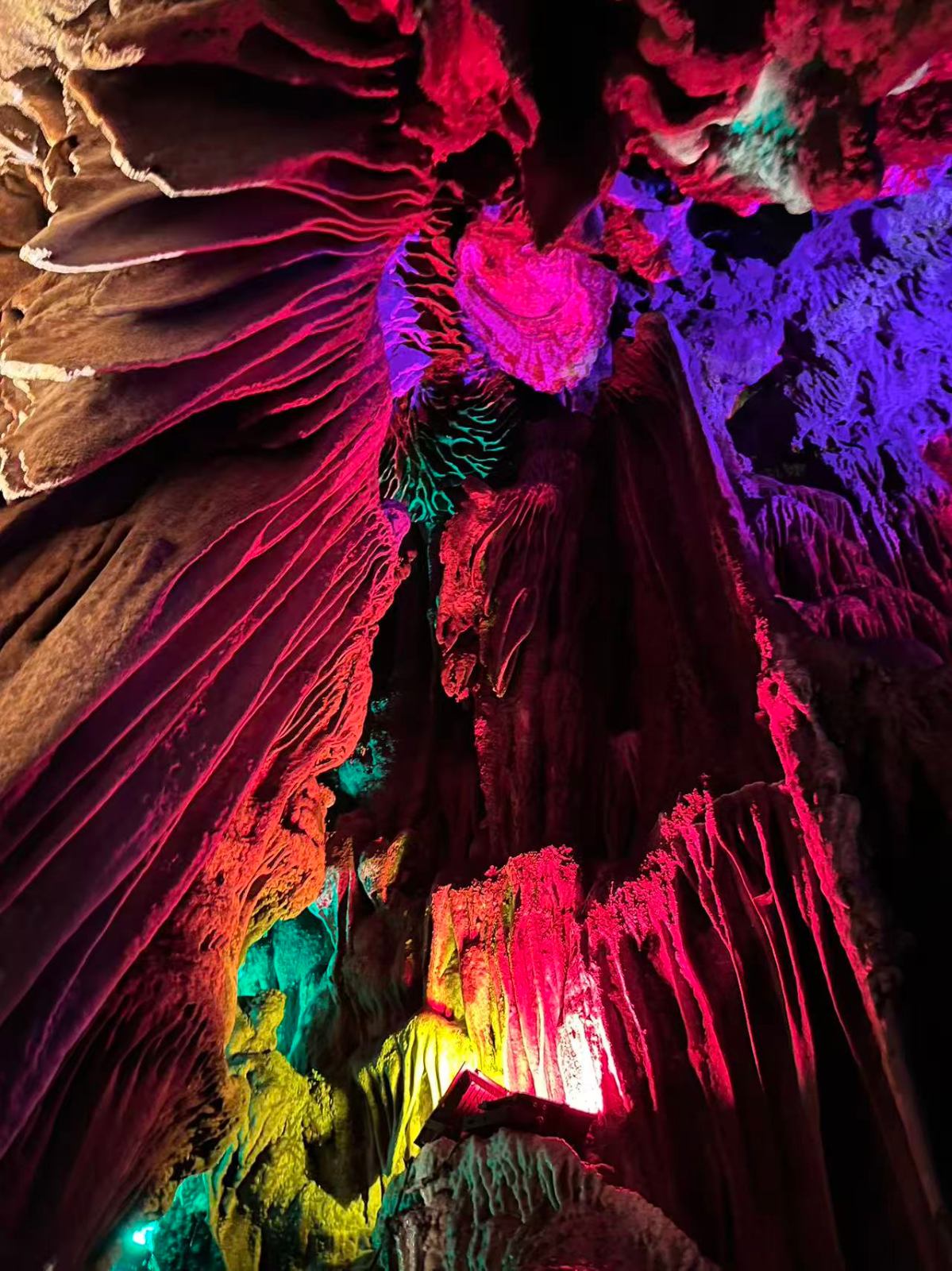 银子岩——走进溶洞,仿佛进入了一个神秘的地下宫殿。五彩斑斓的灯光照亮了形态各异的钟乳石,有的像倒挂的利剑,有的似灵动的仙女,还有的如奔腾的骏马,让人不禁感叹大自然的鬼斧神工。洞内的 “音乐石屏”、“广寒深宫”、“雪山飞瀑” 等景点更是让人拍案叫绝。轻轻敲击钟乳石,便能发出清脆悦耳的声音,宛如一场美妙的音乐会在耳边奏响。漫步在溶洞中,仿佛穿越了时空,领略到了地球亿万年演变的神奇魅力。大家一边惊叹着眼前的美景,一边相互交流着对这些奇特景观的想象,笑声在溶洞中回荡。