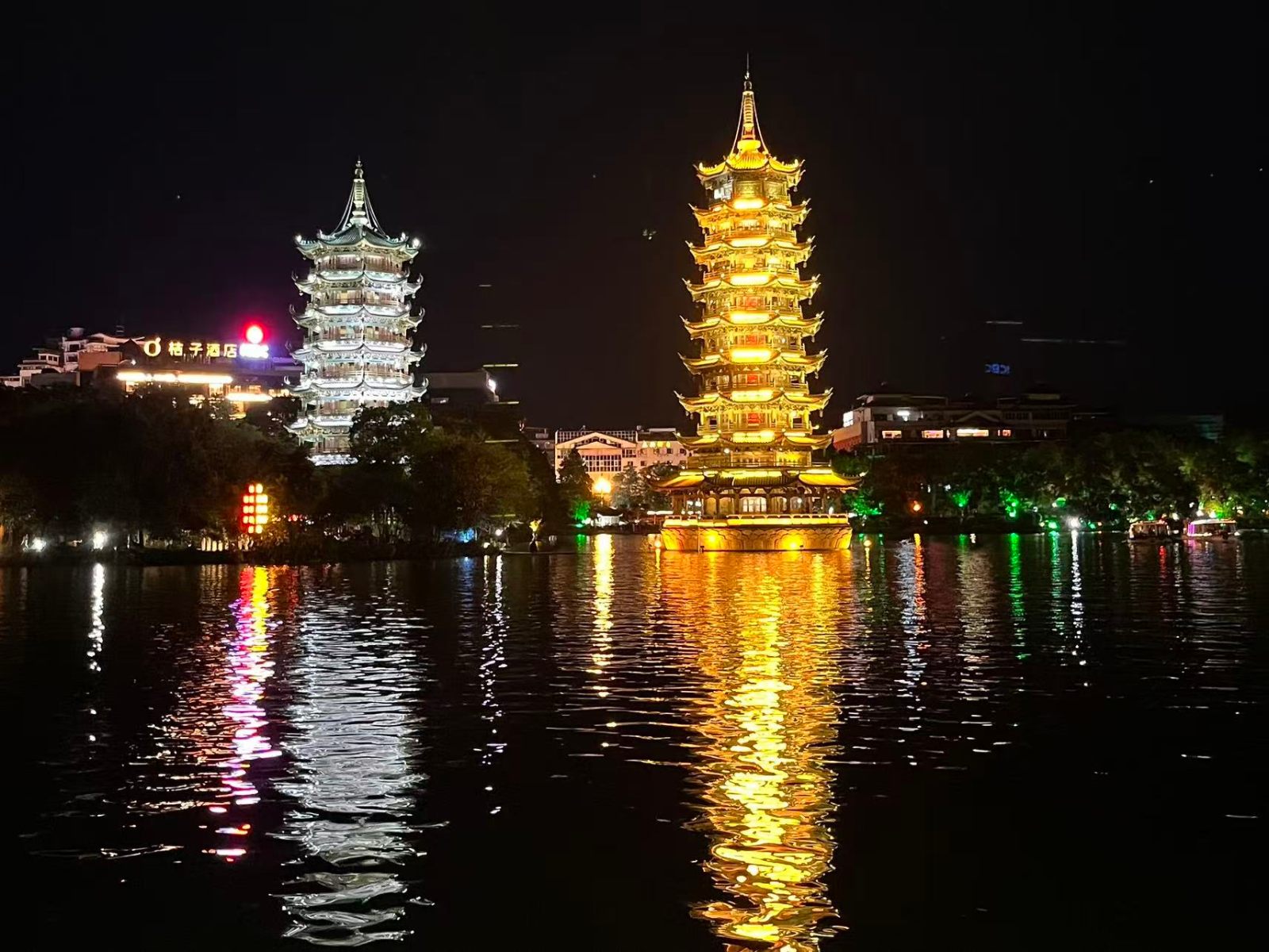 日月双塔—— 白天的双塔古朴雅致,一金一银矗立在杉湖之中,塔身雕刻着精美的图案,透着浓郁的文化气息;待夜幕降临,灯光亮起,金色的日塔与银色的月塔在湖水倒映下交相辉映,宛如童话中的城堡,大家沿着湖边漫步,感受桂林夜晚的浪漫氛围。