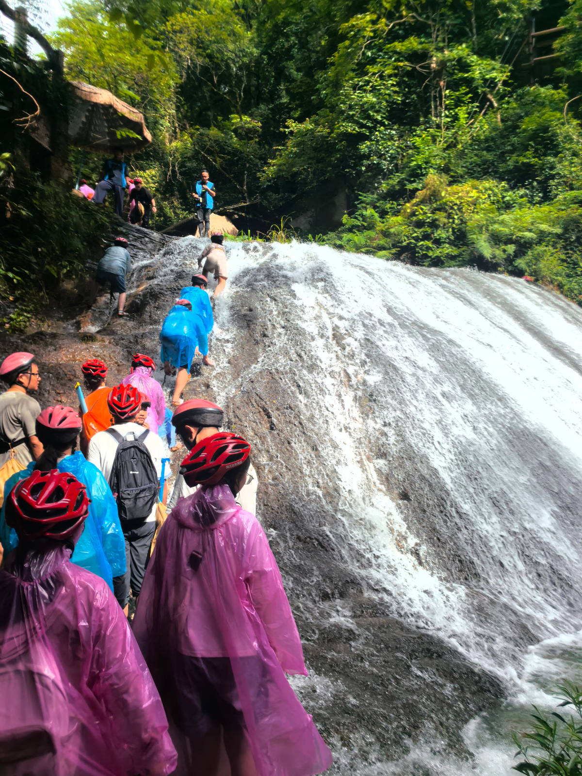 古东瀑布——这是可以攀爬的瀑布,穿上草鞋、戴上安全帽,大家两两结伴向上爬。水流冲击着岩石,脚下有些湿滑,大家互相拉一把、扶一下,齐心协力登顶。站在瀑布顶端,看着下方的青山绿水,成就感满满。